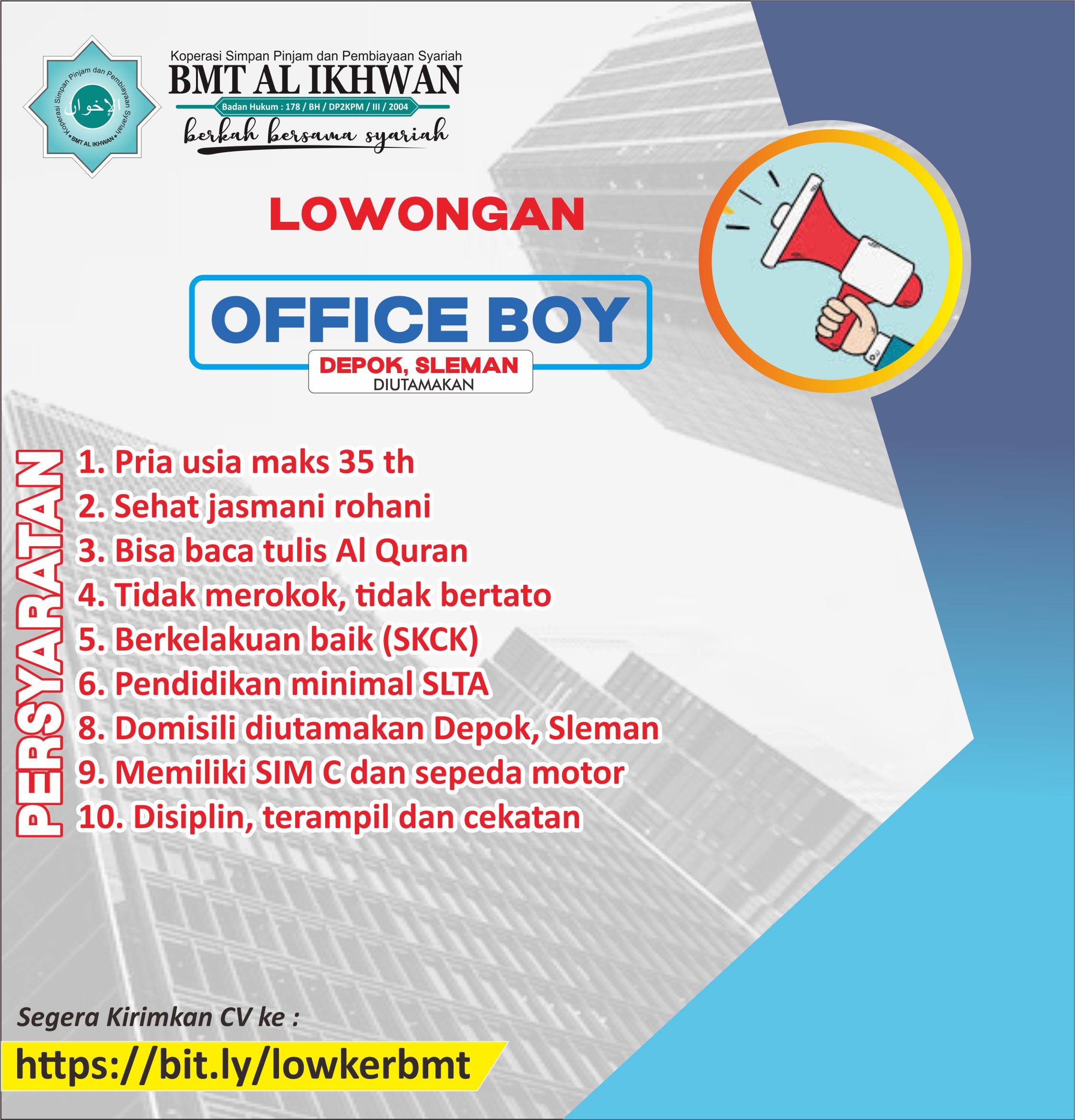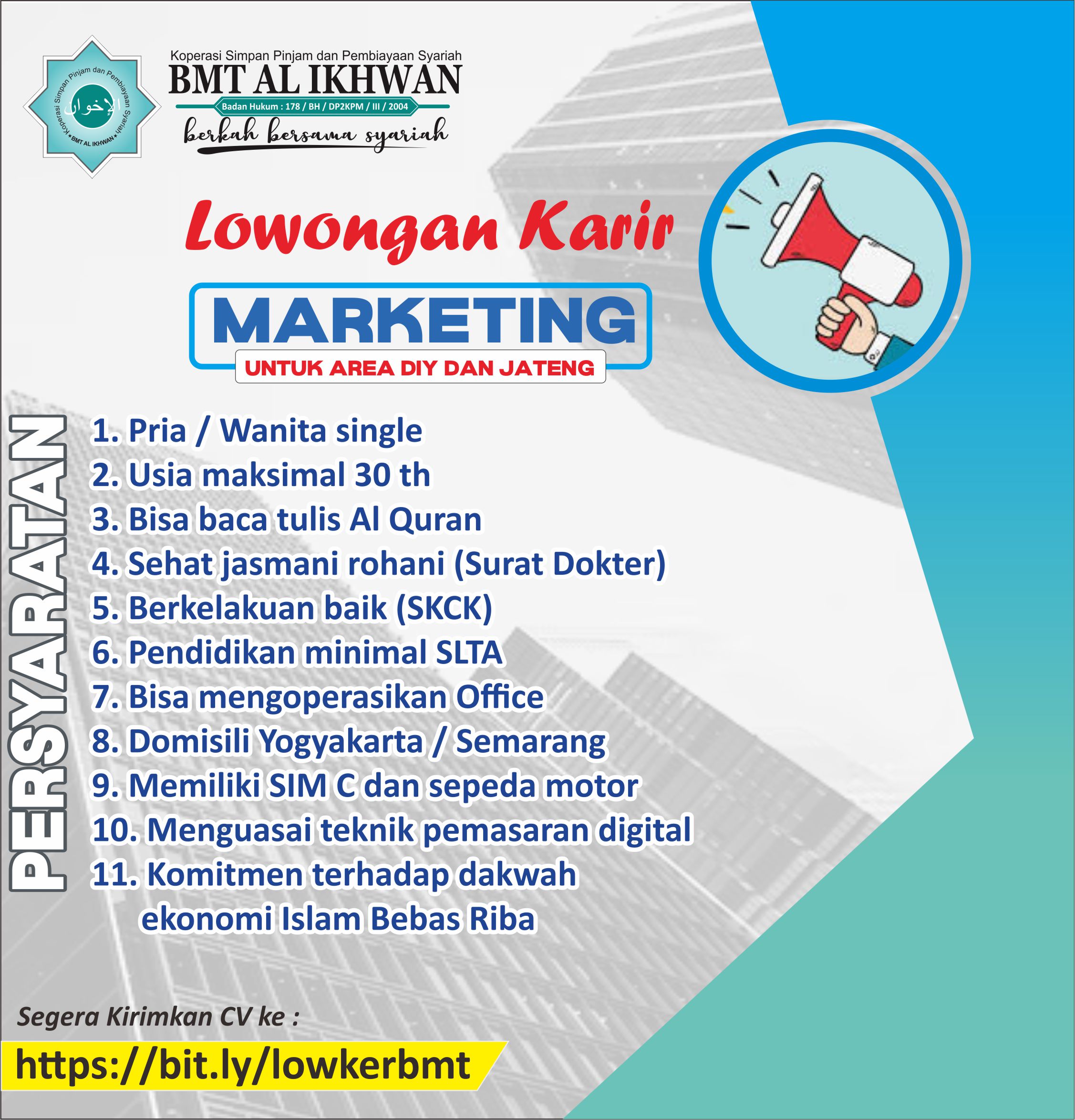 KSPPS BMT Al Ikhwan, sebuah lembaga Keuangan Syariah yang berkantor pusat di Sleman Yogyakarta dan memiliki cabang di Semarang, tahun ini kembali membuka rekruitmen untuk mengisi posisi marketing eksekutif dan office boy .